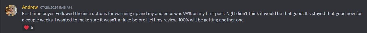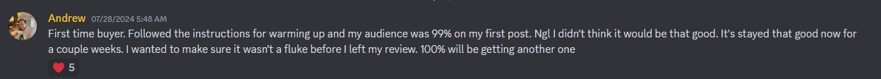 “First time buyer, followed the instructions for warming up and my audience was 99% on my first post”